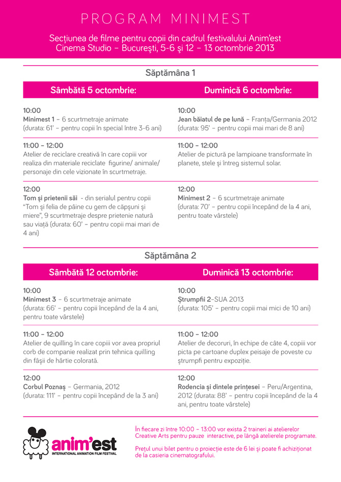 Ziua de sâmbătă, 5 octombrie, începe la Cinema Studio, cu Minimest. De la ora 10:00, cei mai tineri fani ai animației pot urmări un program de șase scurt-metraje, iar de la ora 11:00, un atelier de reciclare creativă le va arăta copiilor cum să realizeze din materiale reciclate figurine/ animale/ personaje din cele vizionate în scurtmetraje. Printre proiecțiile de neratat de la Cinema Studio se numără și Congresul, cel mai nou film al lui Ari Folman (Waltz with Bashir), proiectat de la ora 18:00 în prezența lui Sefi Gayego, animation supervisor al filmului, animator la Waltz with Bashir și fost student al prestigioasei Academii de Artă şi Design Bezalel din Israel. De la ora 20:30 va fi proiectat Max & co. în prezenţa regizorilor Sam şi Fred Guillaume.